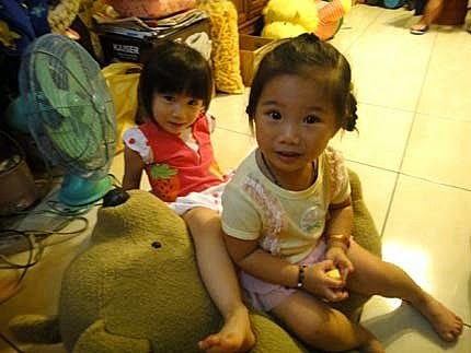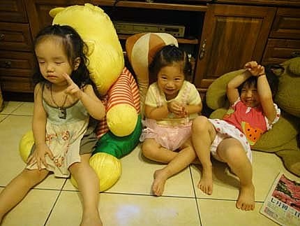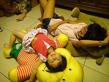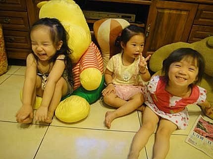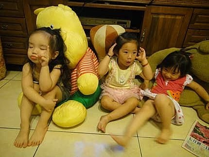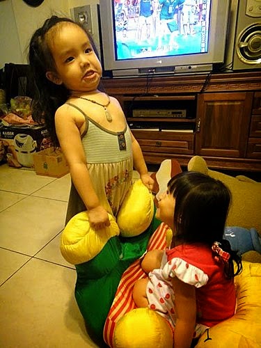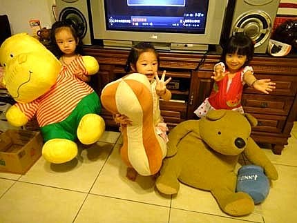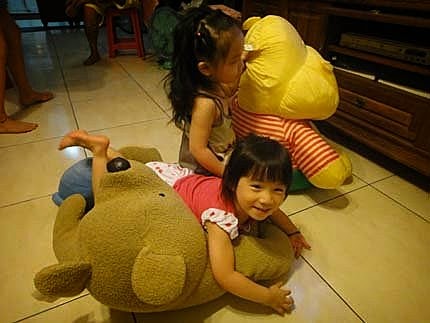 我跟婉茜姊姊躺在大玩偶身上,好舒服呦~ YA~難得我們三姊妹,又聚會在一塊兒玩嚕!