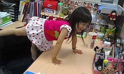 快要下班了~工作的好累喔!起來做瑜珈....運動一下,爬爬媽咪的大桌子,照照媽咪的鏡子~上班好累!也好開心喔~