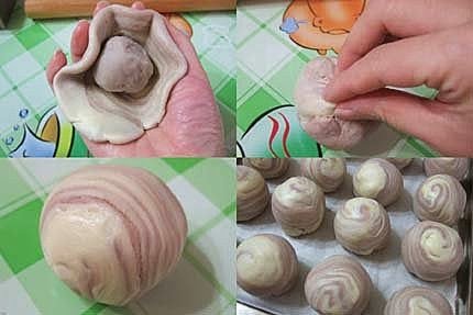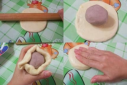 9.切開面朝外,中間放上芋頭餡,收口捏緊,成為一個圓形