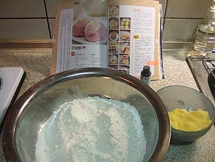 材料:低筋麵粉160g,無水奶油(酥油)80g,芋頭香料(註2)數滴