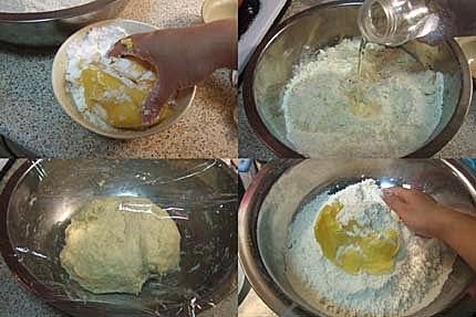 4.將冷水倒入用手攪拌搓揉5-6分鐘成為一個均 勻柔軟的麵團即可