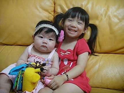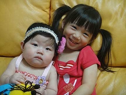 媽咪說:我再不多吃一點飯飯,很快就會被妹妹給"壓扁扁"啦!