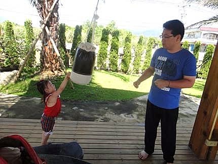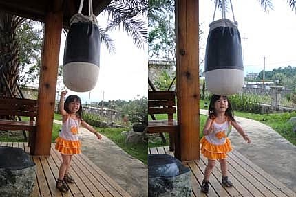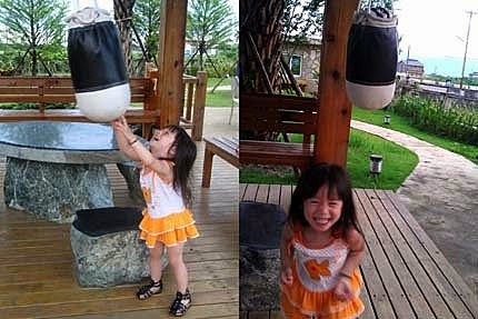 運動健身的沙包,張小妹看到新玩意,就跟她爸比練起拳擊來~