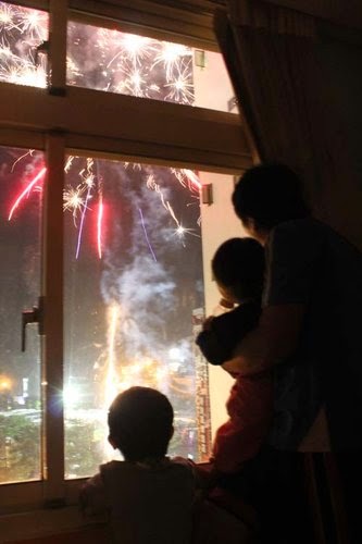 正逢雙十國慶,日月潭在燃放煙火,我們跑到樓上同事的家庭房,望眼過去...正好可以一睹煙火的風采!真的很不虛此行耶~