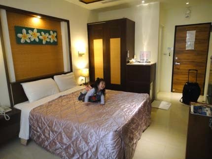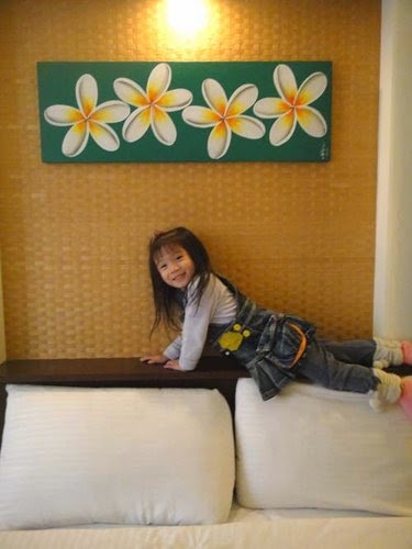 這小妮子~每次住旅館,都興奮的不得了~才一進門...就迫不及待的脫鞋,衝上去"跳床"啦!