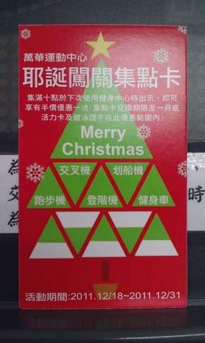 健身房耶誕闖關卡:全部器材都要操作十分鐘以上,完成闖關卡...下次運動一個小時可以半價喔!但是...裡面含了幾種重量訓練!