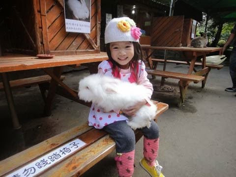 這隻白色的大兔子好可愛~跟我的帽子一樣的顏色喔,我們一拍完兔子,兔子就收工回籠子裡了!難怪...後面比較晚下山的人,會看不到!