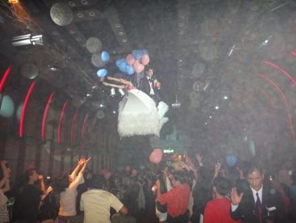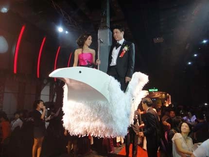 第二次....令人驚艷的"進場"居然是....乘坐飛天鵝,從天而降....引起一陣譁然....還贈送愛心氣球爆米花,造成騷動!