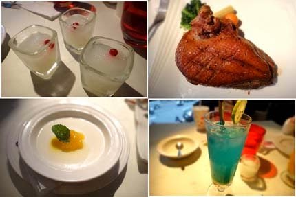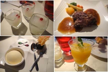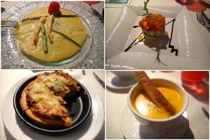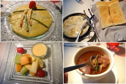 老爺的餐點:鮮蝦蘆筍、焗烤蘑菇+方塊麵包、時鮮水果沙拉、牛楠湯、沙瓦、法式鴨胸、