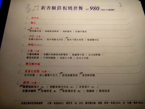 新香榭鐵板燒套餐$980元(另加10%服務費)