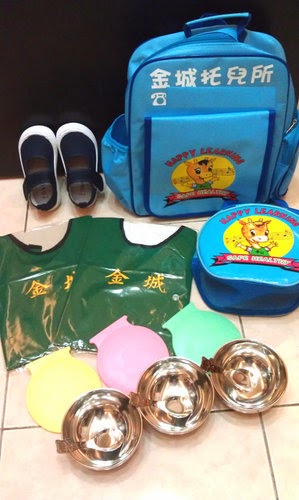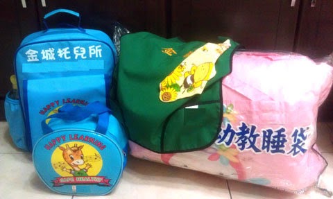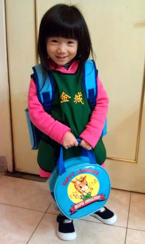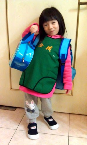 老師親自送來了新書包、便當帶、室內鞋、圍兜~興奮的穿戴,不肯脫下來呢!小女孩~~~長大了!