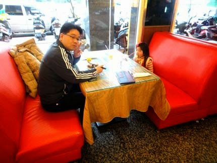 去餐廳吃飯~我最愛坐"沙發區"因為...不用擔心小妞亂動,從椅子上摔下去!她胃口大開...吃不少喔