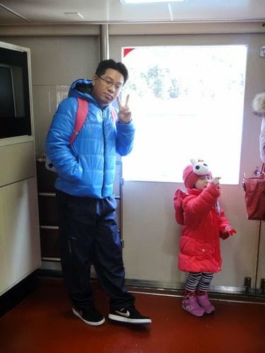 外面海風太冷颼颼~只好躲再船廂裡看風光!