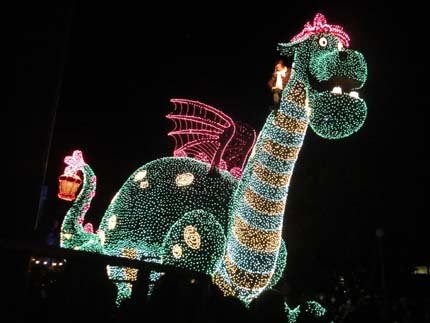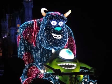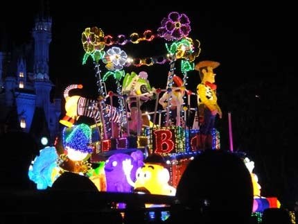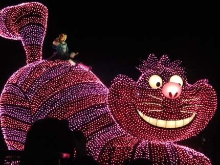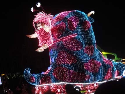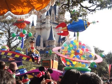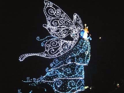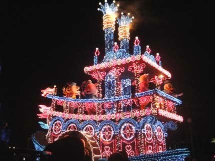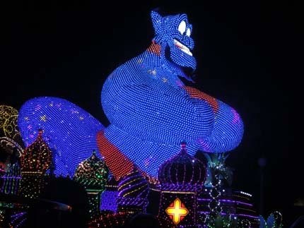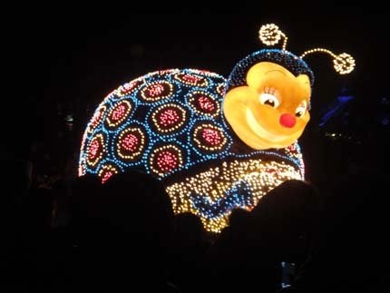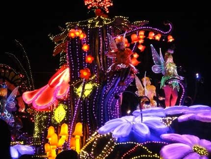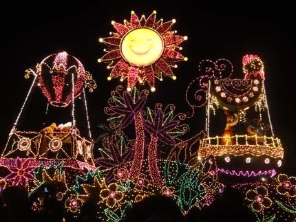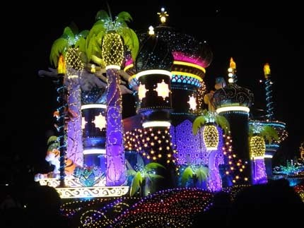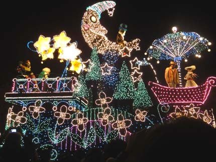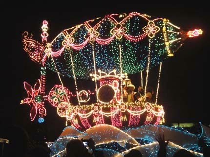 東京迪士尼樂園電子大遊行~夢之光:五光十色的彩燈照耀中,迪士尼卡通明星紛紛登場,與遊客一同度過愉快的夜晚。
