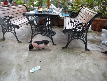 用餐的時候,還能看到母豬帶小豬"逛大街"
