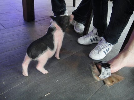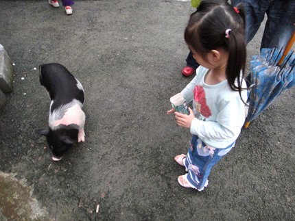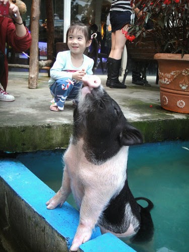 沒多久...換我們這一桌驚叫連連,原來小小豬跑到我們這磨蹭啦!小妞吃飯一直低頭看小豬,興奮連連..怕小豬吃她的腳丫子!