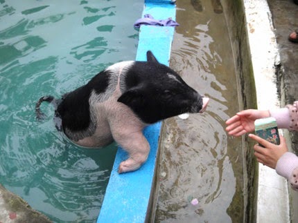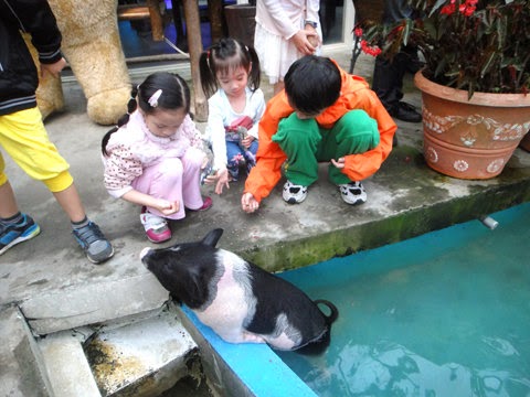 農場主人看到很多小朋友來,就把豬媽媽抱下水池游泳洗澡,果然...引起一陣騷動~不只小朋友,連大人都拿相機狂拍呢!