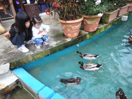 餐廳的門口有一個大水池,裡面有鴛鴦跟鴨鴨在戲水~