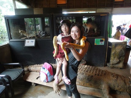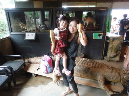 很逼真的鱷魚標本,買飼料給小妞餵食,居然被舔了一下小手,她就嚇的"烙跑"不過...草泥馬真的很貪吃,都用搶的捏!