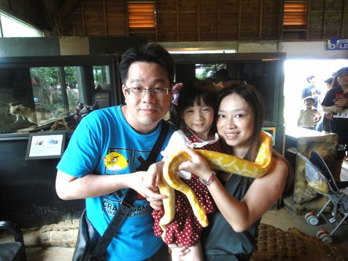 好不容易說服膽小的老爺進來合照,他也只敢輕觸蟒蛇的皮膚~