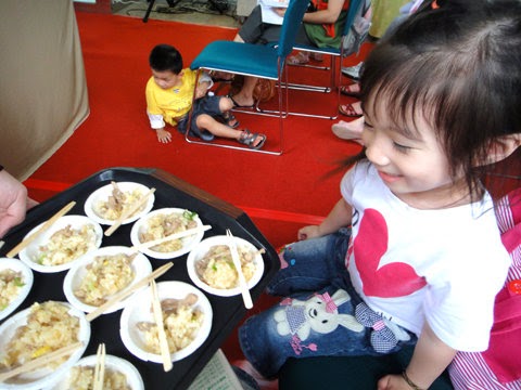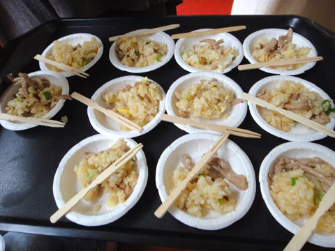 第一道示範料理:肉絲蛋炒飯....因為場地設置在戶外走廊,使用的又是瓦斯爐....火苗被風吹得亂七八糟,控制不了火勢!