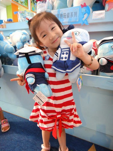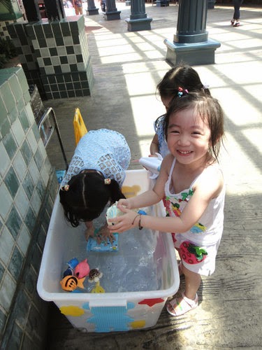 想找個陰涼的地方躲躲太陽~剛好看到精品店外放了一個大水箱+試玩的玩具,小妞開心屬了~