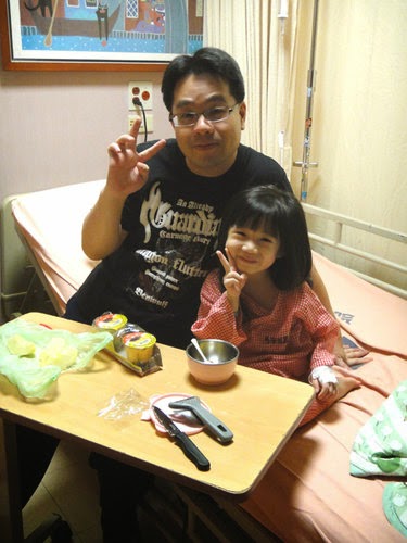 重點是..訪客椅是一張單人的沙發床,不是摺疊式的那一種,陪睡的時候..真的舒適很多~老爺自己睡沙發床,我則跟小妞擠在病床上!
