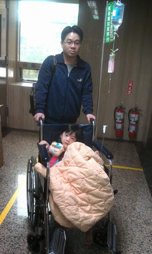 好在...過不到10分鐘,護士推著輪椅來接小妞做檢查,我跟老爺說:你抱她檢查,上次的經驗~我很於心不忍...狠不下心來抓她!