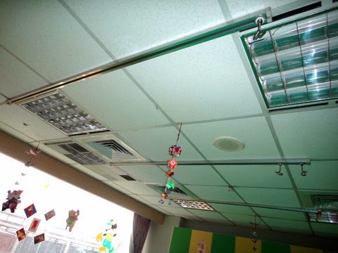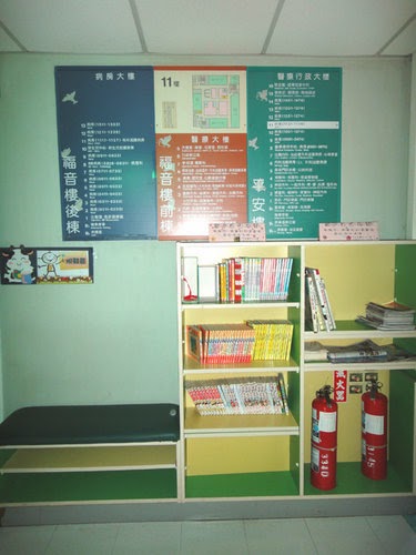 還有閱讀區~還可以借閱到病房裡,最貼心的設計來了~天花板上一條條鋁條,上面好幾個勾勾!